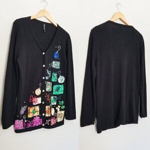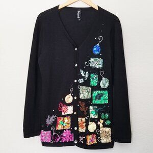 Berek Christmas Ornament Sequins Embellished VNeck Cardigan Ramie Cotton Black M