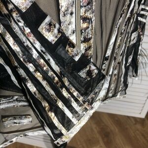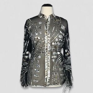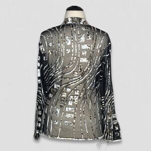 This Berek cocktail blouse features sheer black mesh with metallic silver and gold accents. The shimmering abstract design includes a full zippered front and mandarin collar.