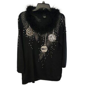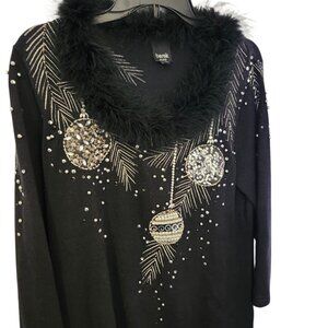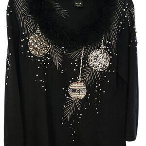 Berek Studio Black Sweater Faux Fur Collar / Embellished Christmas Design