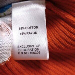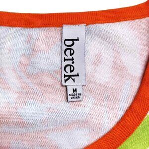 This Berek sweater vest is in excellent condition. Size medium. Reddish orange, light green, turquoise blue, and white colorway. Abstract floral, art-to-wear design. Soft, stretchy knit blend of 55% cotton and 45% rayon. Pullover. Scoop neck. Ribbed details. Sleeveless.