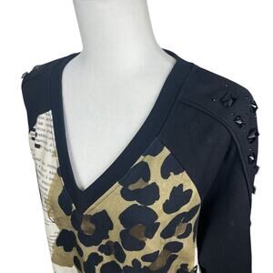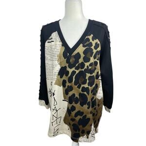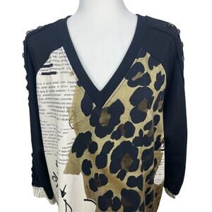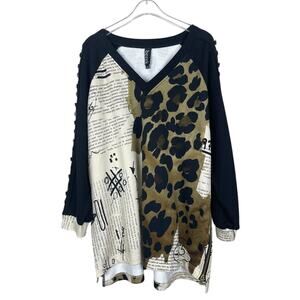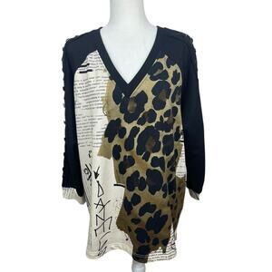 V-neck tunic top with long sleeves in a thicker sweatshirt like material. Embellishments down both sleeves, side zipper detail. Animal and script print. Size large