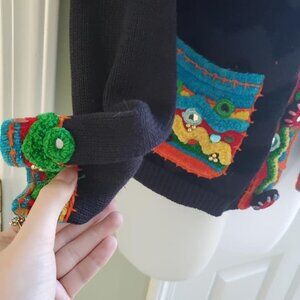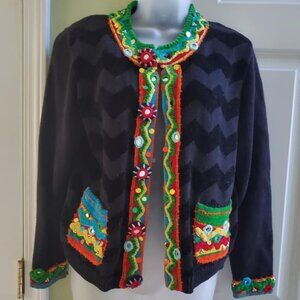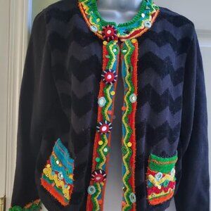 Berek Vintage 90s Chevron Abstract Embellished Cardigan Sweater Small - great preowned condition with minimal wear from use. Statement piece rare Berek vintage 1990s crazy funky geometric sweater. Black knitted with a chevron pattern. Around the scoop neck collar, down the front, pockets, and wrists are rainbow color 3D knitted embroidered geometric patterns and shiny metallic reflective pieces in circles. Chunky buttons down the front with black and red with shiny middles, inner black buttons to easily slide in. Green, blue, yellow, red, orange, rainbow colors. Berek 2 Collective Works Takako Saxon. Rayon, ramie, cotton, and acrylic. Beaded work.