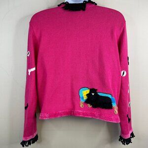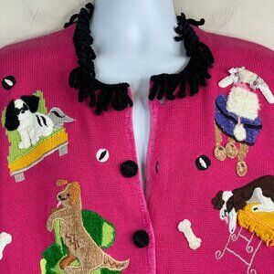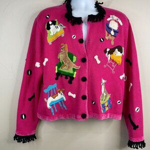 Berek Vintage Womens DOG Embroidered Fringe Cardigan Sweater Size XL Artsy Fun