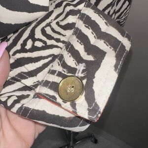 Upgrade your wardrobe with this stylish CHICOS women's jacket in size L. The jacket features a trendy zebra print design, with a button closure and made from a comfortable cotton blend material. The lightweight jacket is perfect for casual occasions and can be easily machine washed for your convenience.