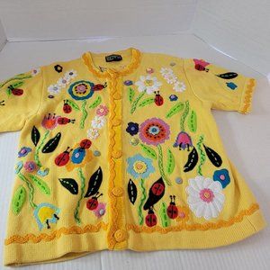 Berek by Takako Sakon Vintage Knit Yellow Crochet Garden Lady Bug Flower Top L
