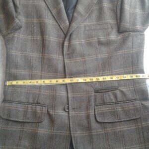 This brand new without tags Beretta sport coat/jacket is Italian made. Tagged size is UK 52/US 42 (no specified length). The shell is 95% wool/5% cashmere, with suede or faux suede material around and in the pockets, the back vents, and other areas. It's a lot nicer than the typical felt behind lapels. Color is a gray/tan brown plaid. A full lining (well, mostly full, see pictures) is featured in 100% Bemberg Cupro. There are two rear exterior vents, three front buttons, four exterior pockets (including an open, flap-less ticket pocket), and one interior pocket on the left. There are no blemishes, or rips or stains in the lining. Features functional sleeve buttons (surgeon's cuffs) behind plackets.