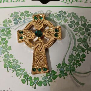 Berkander Irish Lapel Pin Catholic Celtic Cross Gold Tone Green Stone Vintage