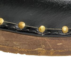 Condition is “pre-owned” and in good condition. See all pics. Small red spot on toe. Wear around wood sole and on heals.