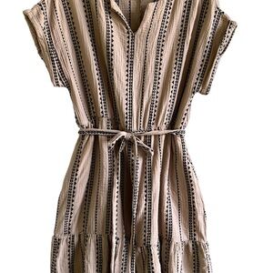 Berkley Jensen, Gauze Dress, Split Neck, Belted Dress, Elastic Waist, Tiered Dress, Black and Tan, Size XL, Plus Size, Bohemian, Boho, Festival, Summer, Embroidered, Neutral, Casual, Office, Vacation, Resortwear,