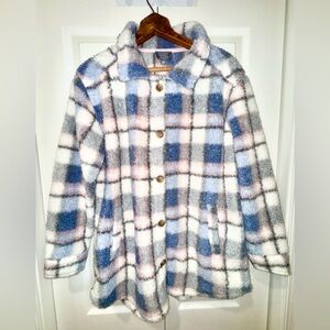 Cozy up in style with this Berkley Jensen Bouclé Sherpa Shacket, the perfect blend of a shirt and jacket. Featuring a soft, plush sherpa texture with a classic plaid design in blue, gray, white, and blush pink tones, this versatile piece is great for layering during chilly days.