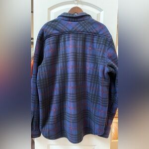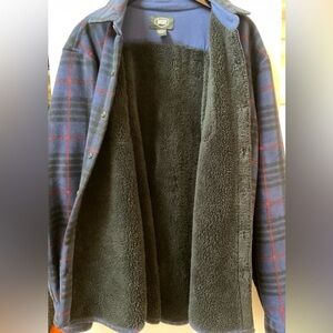 Berkley Jensen Sherpa Lined Mens Shirt/Jacket. Blue Plaid Fleece with Black Sherpa. 100% Polyester. Size XL measures a 50” Chest x 36” Sleeve x 31” Length. In Like New Condition