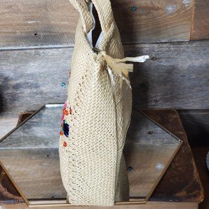 Bermuda Beauty Craft Rafia Embellished Handbag. Appears unused. Lined. Top handles. Embelished in colorful flowers on the front. Measures 10 1/2" wide x 8 1/2" tall x 2" deep. Flat bottom. Handles are 5 12" from top of bag.