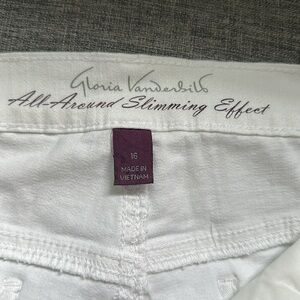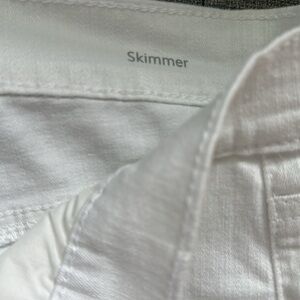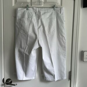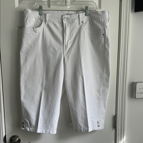 Gloria Vanderbilt white skimmer denim short with all around slimming effect. Inseam measures 15.5”. Is a straight leg with 2 buttons at the hemline on each leg for a decorative effect. Zipper and button front closure. 98%Cotton and 2%spandex. Machine Washable. On excellent condition.