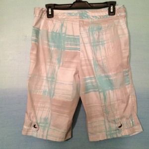 These grey, white and teal Bermuda shorts are perfect for dressing up or down. Very comfortable. A few small stains that are muted by the pattern, overall in very good shape and made well.