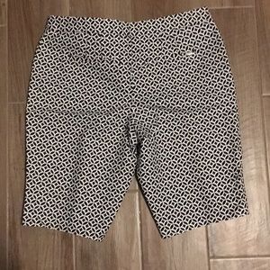 Black and white Bermuda shorts. Super cute pattern! Great for a dressy occasion in the summer. Waist measures 16in. And the inseam is 11.5in.