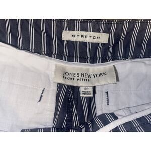 Elevate your casual style with these Jones New York Sport Bermuda shorts in a beautiful blue color with white stripes. Made from a comfortable cotton blend fabric and featuring a mid-rise waist and flat front, these shorts are perfect for any casual occasion. The shorts have a zip closure and slash pockets for added convenience.