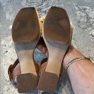 Chic sandals with a cork block heel. Features a tan strap and cream textured front. Adjustable buckle for a custom fit. EXCELLENT LIKE-NEW condition.
