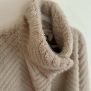 The Echelon Beige Faux Fur Coat boasts a refined, classic fit with a hip-length cut that combines sophistication with comfort. Its extra-large collar and wide sleeves introduce a touch of dramatic flair, ensuring both style and warmth. Crafted from beige faux fur, this coat provides luxurious insulation that doesn't skimp on style.