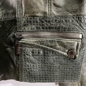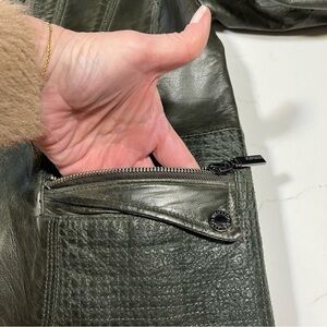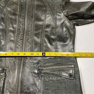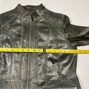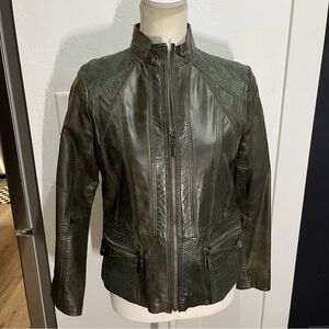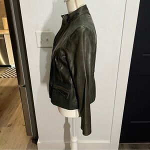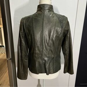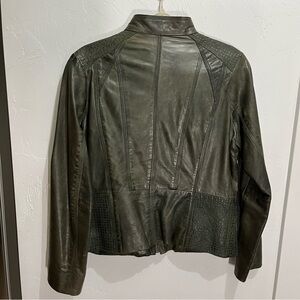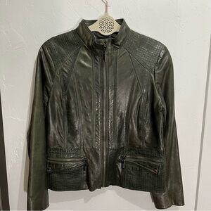 Vintage green leather jacket. In amazing condition, but reposhing because it is too small for me. Measurements are in the photos. Runs small for a large petite. Fits more like a small.
