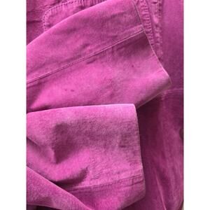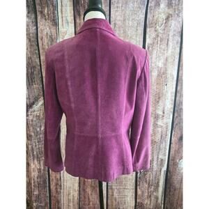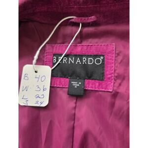 Add a touch of luxury to your wardrobe with this beautiful Bernardo suede leather jacket! In a lovely dark pink shade, this jacket is sure to turn heads. It is in good, pre-owned condition. There are a few tiny water spots that may come out with a suede brush, but the price reflects this minor imperfection. The best part? This jacket is machine washable! (Though I haven't personally tested this feature).