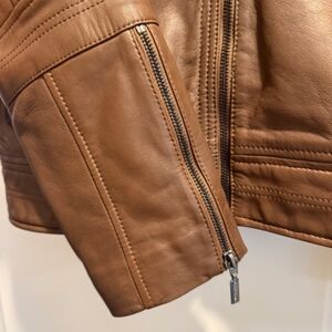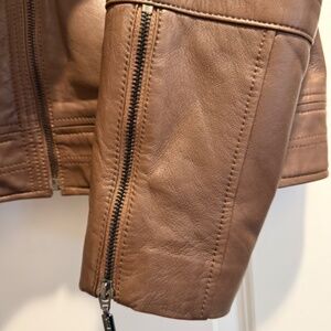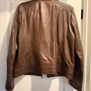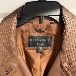 Bernardo Leather Moto Jacket, Saddle Brown, size XL, Excellent used condition. Perfect for fall with dresses or jeans and a t-shirt. Classic and stylish staple leather jacket for fall. I only wore this jacket a handful of times and now it is too large for me due to weight loss. Making room in my closet for something different.