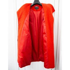 Warm and fuzzy fully lined orange boucle coat with exterior side open pockets. Hidden snap button closure, wool blend, oversized collar. Pre-owned, excellent condition.