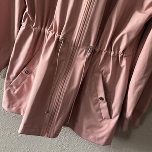 This chic pink trench coat by Bernardo combines style and functionality with its lightweight design and adjustable drawstring waist. The hood adds a practical touch, making it perfect for unpredictable weather. Ideal for casual outings, this coat offers a modern twist on a classic silhouette.