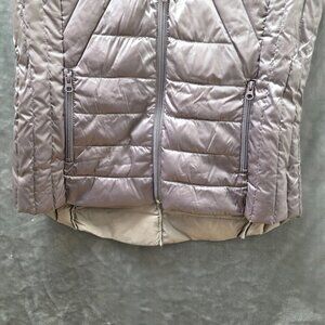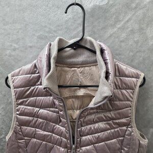 Bernardo women's puffer vest in a soft mauve with zip front and ribbed collar. Size medium. Filled with 90% down for warmth without the bulk. Two front zip pockets.