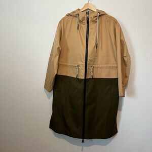 Bernardo Two-Tone Long Hooded Jacket Green Camel Women's Size Small