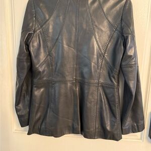 Sleek and stylish leather jacket. Features a full zip front. Perfect for versatile wear. In excellent preowned condition