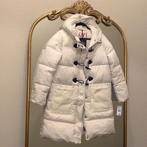 Combo fabric heavy puffer with hidden center front zipper, toggle closures,