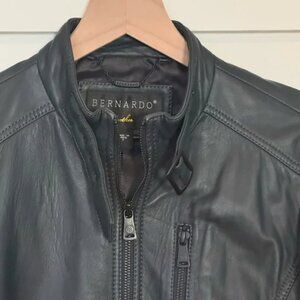 Bernardo leather jacket with zip front. Features sleek design and chest pocket. Perfect for any occasion.