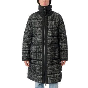 The blend of polyester and wool provides a soft yet durable texture, while the padded puffer design ensures maximum warmth during chilly days. Featuring two front pockets for convenience and a zip-up front, this jacket offers a sleek, structured silhouette perfect for both casual and dressy looks.