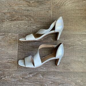 Beautiful silver slip on sandals from Bernardo. Leather up, insole, sole. Top strap has some elastic to ensure a good fit. 2 inch heel. So feminine in design and easy to wear!