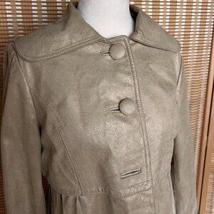Bernardo tan genuine leather peacoat. Has a metallic shimmer to it. Small spot on upper left of jacket and it is missing the bottom button. Bottom of sleeves has normal wear. Size is petite medium.
