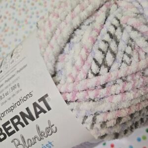 Soft and cozy Bernat Blanket Twist yarn in a mix of gray, white, and pink. Perfect for knitting and crochet projects. Color: Lilac Grove 10.5 oz