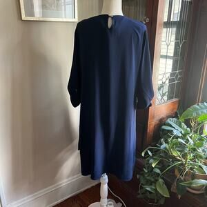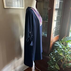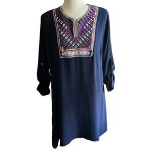 Berne Navy Blue Embroidered Sheath Dress Size 44 L Roll Tab Sleeves Split Neck