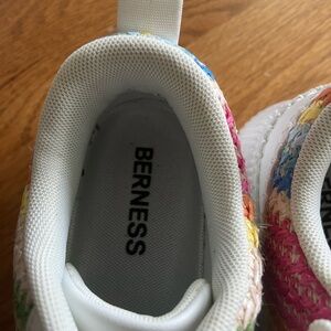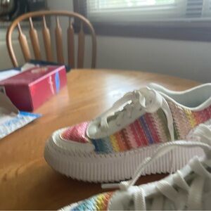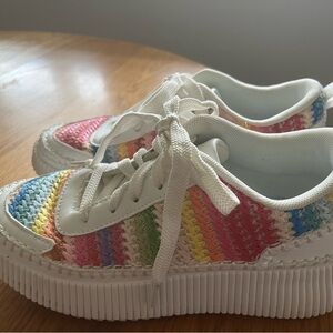 Vibrant sneakers with a rainbow knit design. Features white laces and trim.