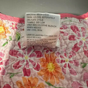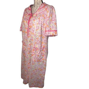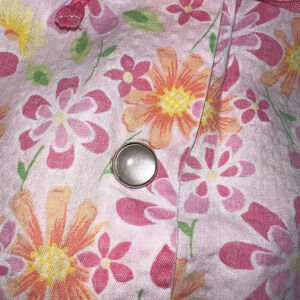 Bernette,L,enamel button snap front quilted neckline with attached string bow gathered pockets with piping, mid lightweight pink, pastel floral gown