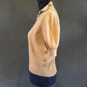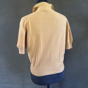 Vintage Bernhard Altmann short-sleeve cashmere top. Soft, luxurious Austrian 100% cashmere in a warm camel/beige tone. Polo-style collar. This piece has a hole and thinning under right armpit (see photo). Otherwise, lovely vintage texture; some pilling and wear consistent with age. Great for layering or restoration. Ideal for collector or someone comfortable with small repairs.
