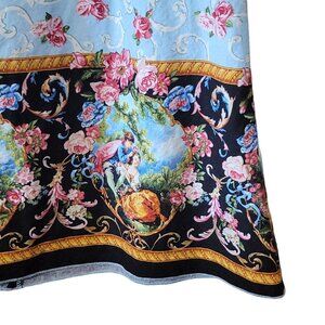 A charming and comfortable dress by Bernie Dexter, made from 100% cotton. Ideal for warm weather, featuring a beautiful floral print and a romantic scene at the hem.