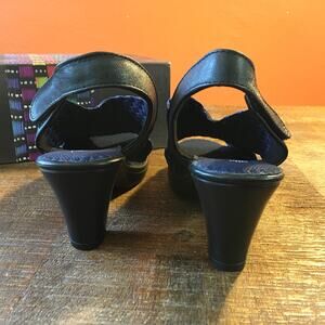 NIB Bernie Mev Beatrice Pumps in color Jeans (Blue/Black). Womens size EU 38, US 7.5-8. 3" Heel. 0.75" Platform. Slip on. Hook and loop adjustable ankle strap. Open toe. Comes with shoe bag and box.