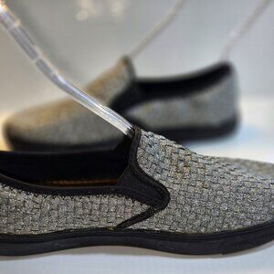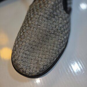 Like new sparkly woven metallic pewter slip-on loafer sneakers. Twin gore and 1 inch black platform soles and cushioned insoles.