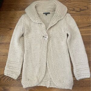 This is a fabulous Berretti knit cardigan sweater. It is made in Italy and is 40% acrylic, 30% wool, 15% mohair and 15% alpaca and is shockingly soft! The sweater has different knitted pattern along the wrists, chest and back. The collar is oversized and accents the look! There is one large button closure and the sweater is in great condition. Sweater is a size small.