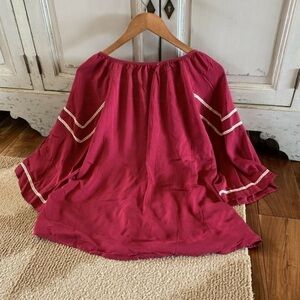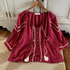 Boho Button Down Tunic blouse in a beautiful berry color. This blouse features Tassel ties, & pretty crochet piping on either side of the buttons down the front, in a chevron pattern at the top of both sleeves and at the bottom of each sleeve. The top is Rayon in a beautiful berry red base color with the ivory crochet piping. So pretty!