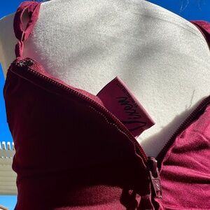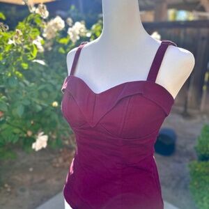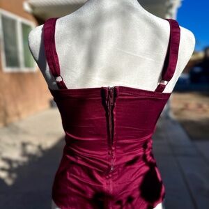 Vixen by Micheline Pitt Maneater burgundy/ berry corset top with adjustable straps, and a zipper in the back. Fits size 2/XS. Lots of stretch!!! #corsettop #lingerie #vintage #1950s #pinup