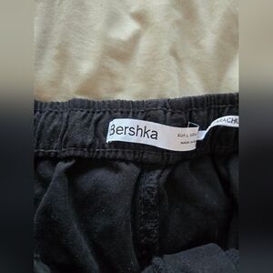 These Bershka parachute pants are in size L with a drawstring closure and a waist size of 34 inches. They are black jogger-style pants designed for casual wear, machine washable for easy care. The pants feature a modern design suitable for everyday use, showcasing the Bershka brand known for trendy and stylish apparel. Perfect for a relaxed and comfortable look, these pants are a fashionable choice for women looking for a versatile addition to their wardrobe.