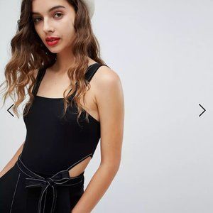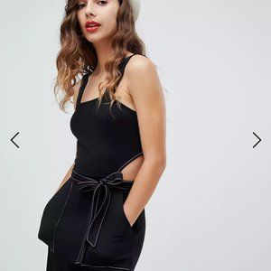 Only worn once. Super flattering contrast stitch jumpsuit. Came without the bow however, but still super cute without it!