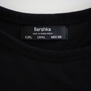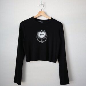 Long sleeve black crewneck cropped top with embroidered graphic on front