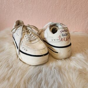 Shoes are in gently worn condition with an intentionally "worn" look. Graffiti style design and a platform base. Great for daily wear. Size 39, fits like an 8.5-9